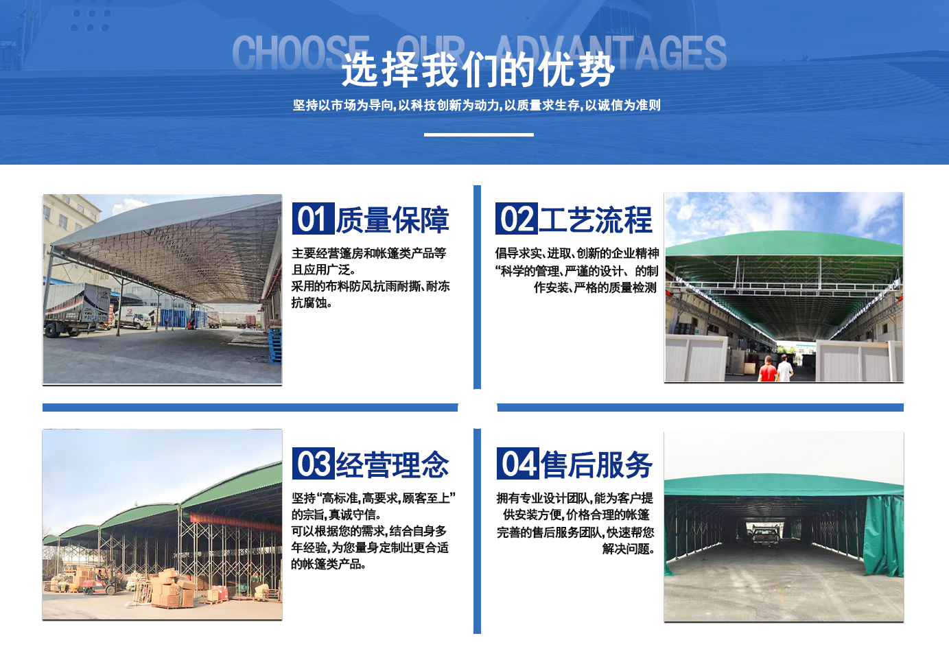 遼寧拓圖鋼結構工程有限公司是一家專業(yè)從事推拉篷設計、制作、安裝、使用、維修的綜合性公司。公司主營:電動雨棚、活動雨棚、倉庫雨棚、體育類雨棚、篷房、篷布、帳篷等系列產品的制作與安裝。    遼寧拓圖鋼結構工程有限公司堅持以市場為導向,以科技創(chuàng)新為動力,以質量求生存,以誠信為準則,倡導求實、進取、創(chuàng)新的企業(yè)精神。“科學的管理、嚴謹?shù)脑O計、 的制作安裝、嚴格的質量檢測、良好的后期服務成就企業(yè)的信譽,為您提供優(yōu)質服務。    遼寧拓圖鋼結構工程有限公司傾力于開發(fā)應用三維空間結構與新材料的結合,將廣告藝術視覺表現(xiàn)形式與張力膜材科學的結合,推出多彩推拉蓬,依靠先進的科學技術,將推拉蓬建筑表現(xiàn)形式無限延伸,立志走在建筑科學的前沿,引導建筑時尚潮流,我們的目標是使推拉蓬建筑在中國發(fā)展壯大。    遼寧拓圖鋼結構工程有限公司憑著極強的事業(yè)熱情和豐富的專業(yè)經驗以“勤勉進取、銳意創(chuàng)新、至誠至信”的精神使公司得到迅速健康發(fā)展,業(yè)務范圍遍及全國。科學的管理、嚴謹?shù)脑O計、高標準的制作安裝流程,嚴格把控產品質量,熱誠的售后服務是企業(yè)競爭力的源泉。    遼寧拓圖鋼結構工程有限公司人愿以最誠摯的態(tài)度,歡迎廣大客戶的蒞臨與溝通!愿為市場提供優(yōu)...